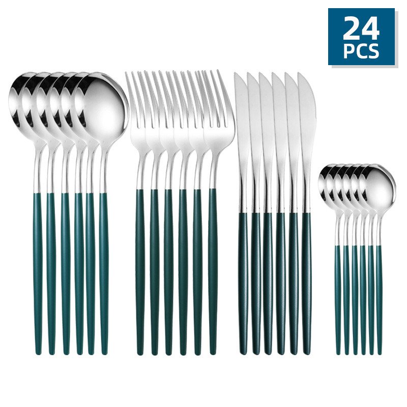 24pcs/Set Stainless Steel Cutlery; Portuguese Cutlery Spoon; Western Cutlery Set - Silver + Green