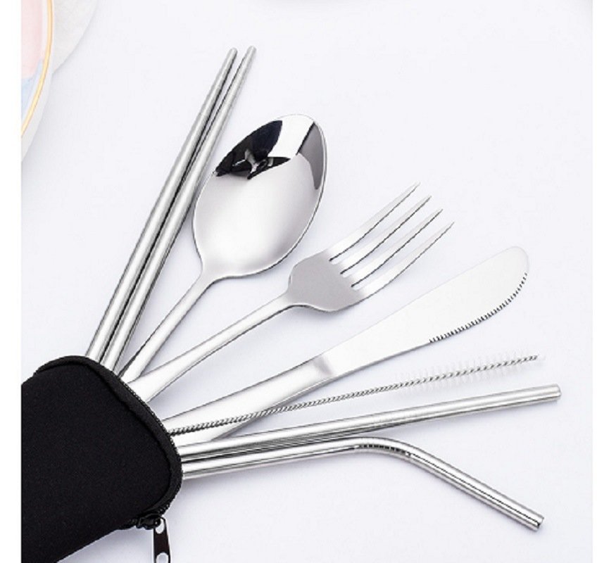 1.Stainless steel cutlery set, spoon, fork, knife, chopsticks, thick straw, thin straw, curved straw, clean brush 8 piece, with mini zipper case for flatware and cotton flannel bag for straw ,easy to carry, nice for traveling camping and other outdoor party.