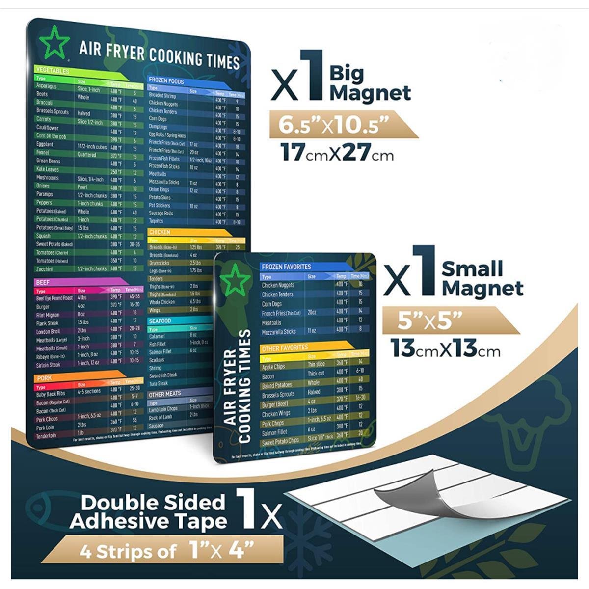 1.Each pack comes with 2 cooking time cheat sheets for air fryers that show the Cooking Time, Temperature, and Size of food to take the guesswork out of cooking, so you don’t have to waste time looking things up. LARGER font is printed on the small magnet with your most popular Frozen Foods for even e