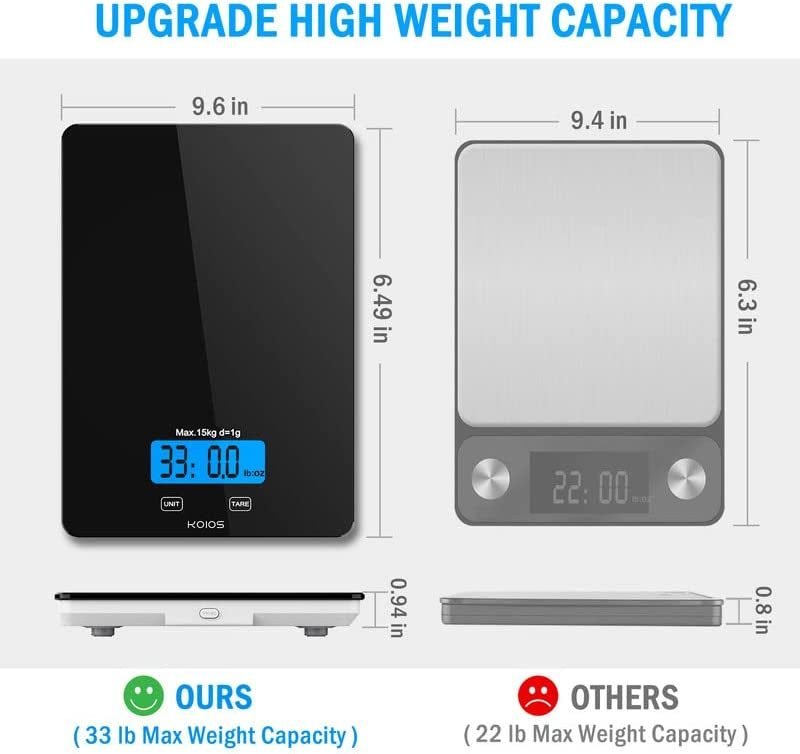| 33lb Max Weight Capacity The digital food scale weighs foods up to 33lb/15kg, while the min weight is 2g/0.1oz. Four built-in weighing sensors ensure an accurate reading of foods. Heavy ingredients measuring is not a problem for your new KOIOS kitchen scale. | Accurate Measurement This kitchen scale measures in precise increments of 1 g/0.1oz to accurately weigh your items, it can help you to weigh seasonings more accurately and making tasty cuisine. | 6 Units Available You can easily choose among measurements in g, kg, lb:oz, oz, ml, ml(milk) include water and milk volume measurement modes. Enrich your meal prep routine with KOIOS food scale to get your precise measurements instantly. |