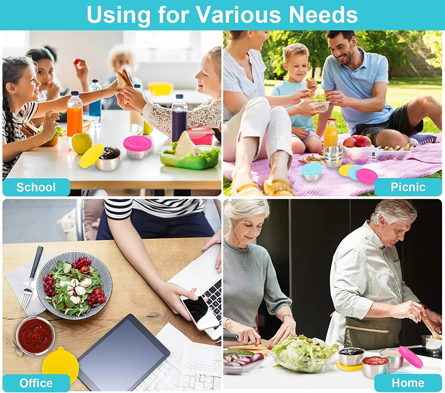 [Safe & Reusable]Made of food-grade silicone and premium 304 stainless steel; our condiment containers are safe for kids and adults. It is dishwasher and freezer safe; easy to clean and reusable; which can replace the disposable plastic containers. Reducing waste and protecting the environment while saving your money.